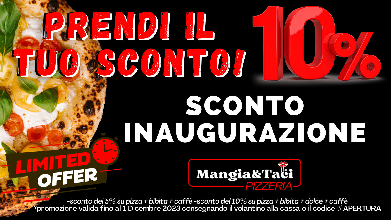 - sconto del 5% su pizza + bibita + caffè- sconto del 10% su pizza + bibita + dolce + caffè*promozione valida fino al 1 Dicembre 2023 consegnando il volantino alla cassa oppure mostrando il codice #APERTURA